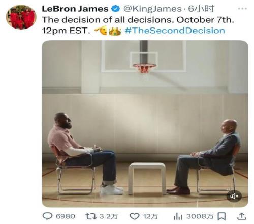 10月7日凌晨,湖人老大詹姆斯突然更新了推特動態(tài),他寫道:“所有決定中的決定,10月7日,美東時(shí)間中午12點(diǎn)。#決定2”換算成北京時(shí)間即明天凌晨0點(diǎn)。