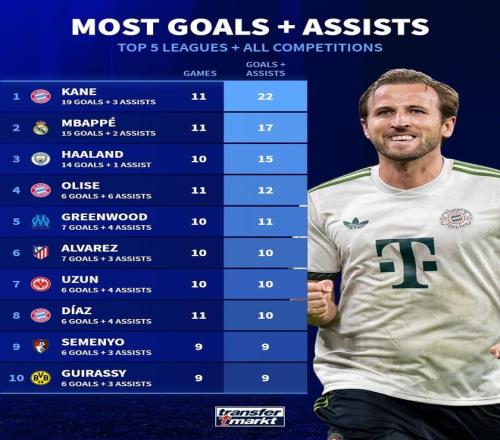 1.凱恩 22球 拜仁 (11場(chǎng)比賽19球3助攻)